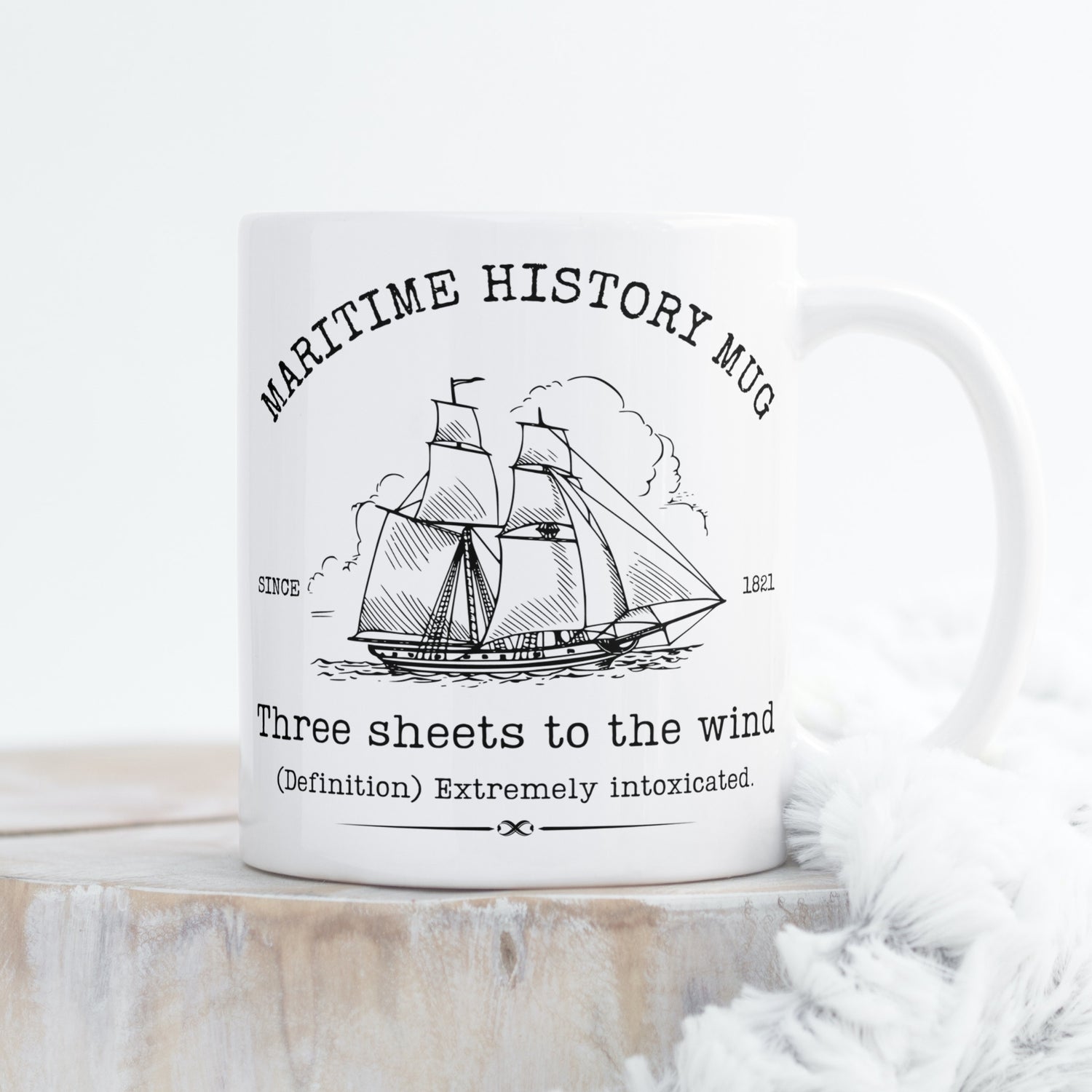 Classic, elegant and timeless pure white ceramic mugs. Mariner designed and adorned in a vintage style with famous nautical phrases and facts dating back hundreds of years from the maritime world.