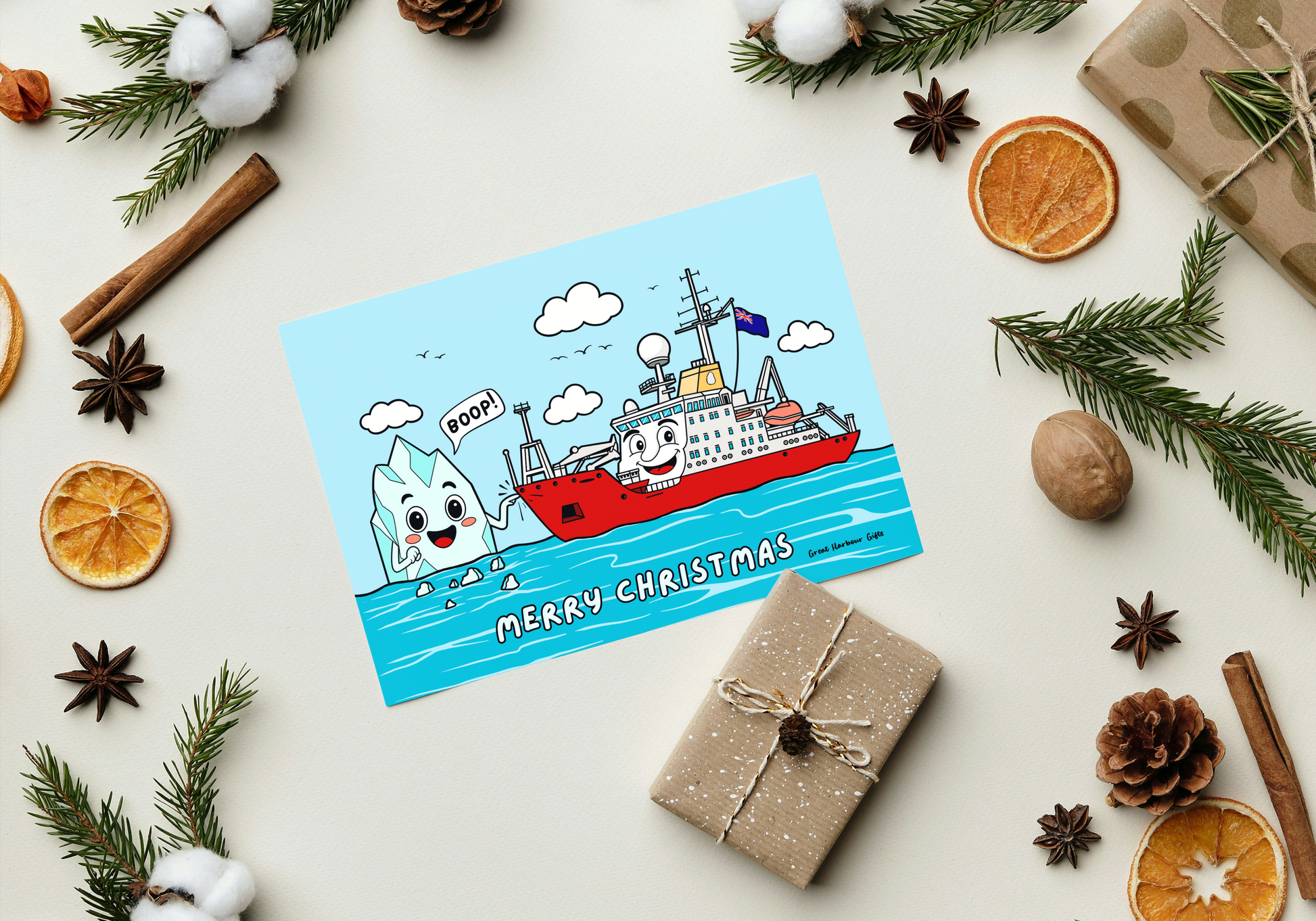 A cheery hand-drawn cartoon of an Icebreaker ship being 'booped on the stem' by a Southern Ocean Iceberg! A real seafarer designed this funny cartoon from his experiences and voyages in Antarctica. This cartoon is available in a variety of cards, prints and framed wall art.